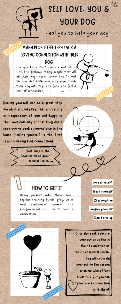 Image description: brown paper like background, infographic size. With the title: Self love, you & your dog and subtitle Heal you to help your dog. The left hand side has a stick person holding a sign with a love heart on it.