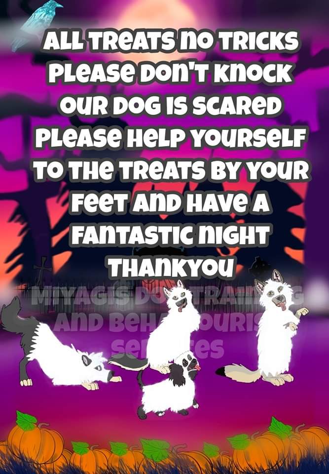 White text with black shadow reads: All treats, no tricks. Please don’t knock our dog is scared. Please help yourself to the treats by your feet and have a fantastic night. Thankyou