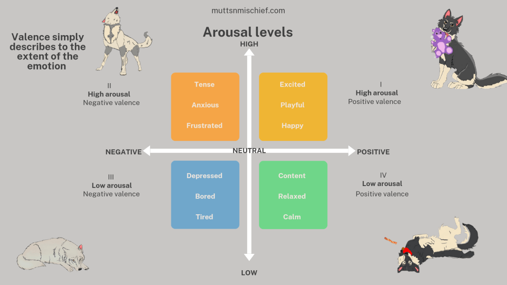 For example, when a dog is excited to see you, their guardian or play with a toy, their emotions would be located in the upper right quadrant of the circumplex, indicating positive valence and high arousal. Conversely, if a dog is fearful or anxious, their emotions would be located in the lower left quadrant, indicating negative valence and potentially high or low arousal depending on the situation.
