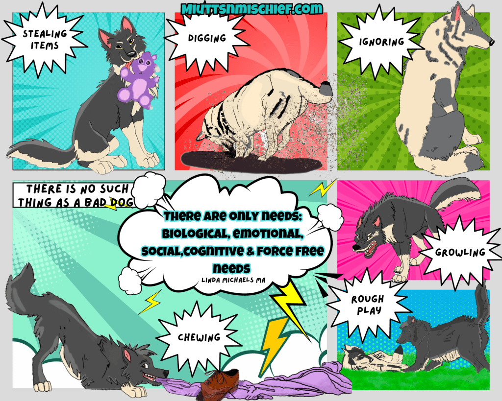 The left bottom window has a grey Wolf Dog play bowing, dragging a purple blanket with a brown half eaten shoe. With a green background. A star label text box reads: chewing. There is also a cloud with thunderbolts. The text inside reads: There are only needs: biological, emotional, social,cognitive & force free needs. Linda Michaels MA.