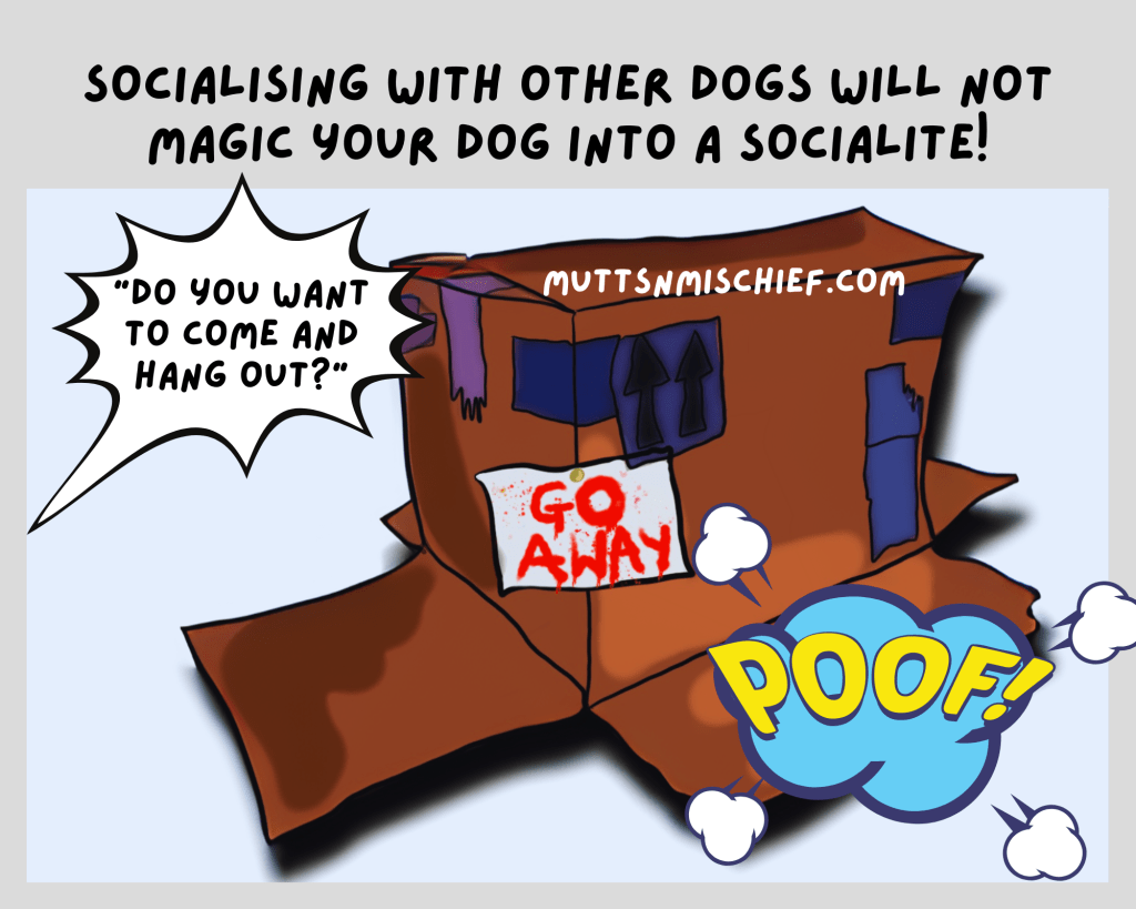 Image description: A grey comic book window. The title reads Socialising with other dogs will not magic your dog into a socialite. The window has a cardboard box upside down which has a sign that reads: go away. In red spray paint. Someone is saying off screen: ” Do you want to hang out?”