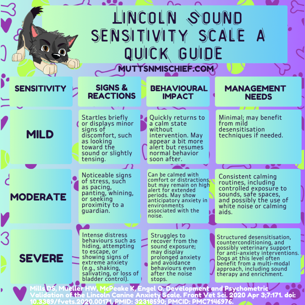 Using this scale helps identify the degree of a dog’s sound sensitivity, allowing guardians and behaviourists to create tailored management plans that align with the dog’s specific needs. This assessment is also helpful in tracking a dog’s progress if they are undergoing sound desensitisation or anxiety-reduction training.