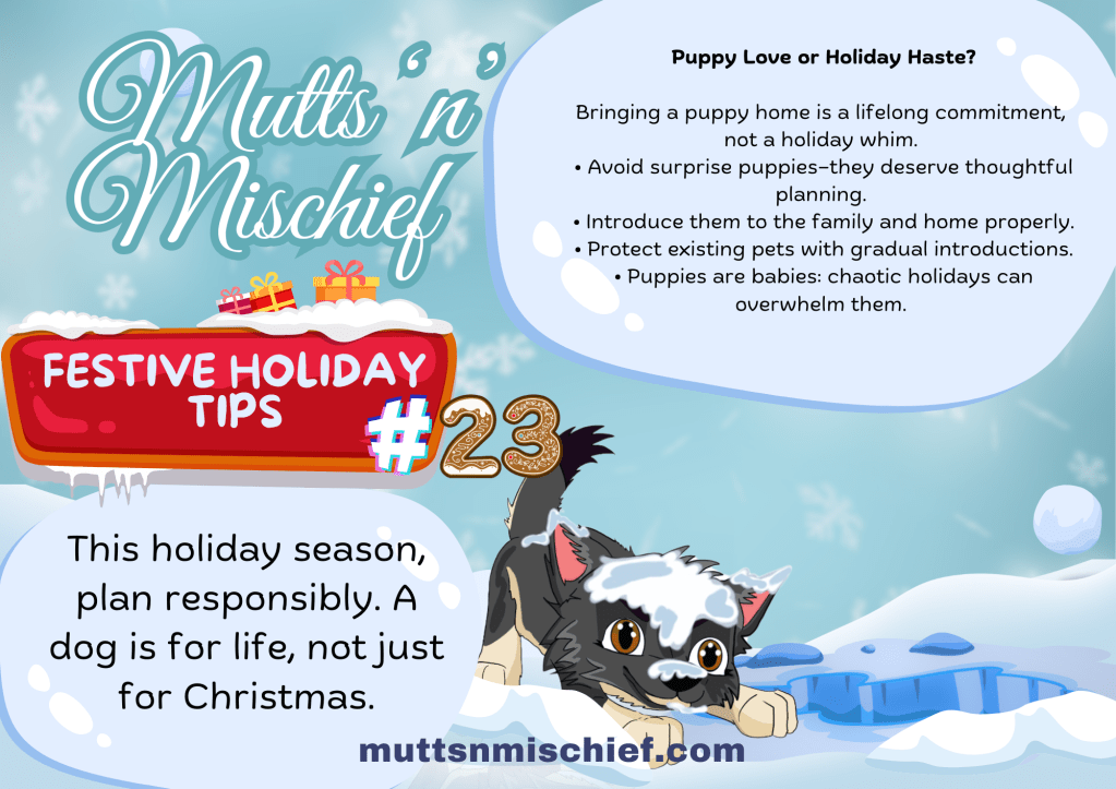 The saying may be overused, but it holds true: A dog is for life, not just for Christmas. Many responsible breeders and rescue organizations refuse to rehome dogs during the holiday season unless under exceptional circumstances. This is because dogs and puppies adopted impulsively during the holidays are at a higher risk of abandonment, as seen during the COVID-19 pandemic when shelters became overwhelmed with unwanted pets.